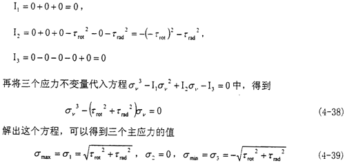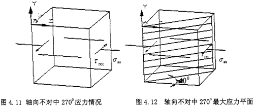 此時的受力由圖上可以看出,屬于空間應力狀態(tài),其基本分析過程類似于徑向不對中900狀態(tài),現在將徑向不對中2700時的受力情況:σxx=0,σyy=0,σzz=0,τxy=-τrot,σyz=0,σzx=0,σzxrod分別代入式(4-29)(4-30)(4-31),得到