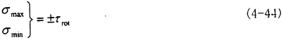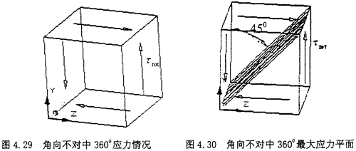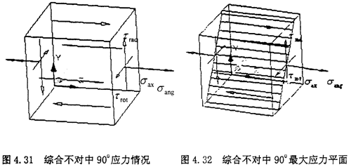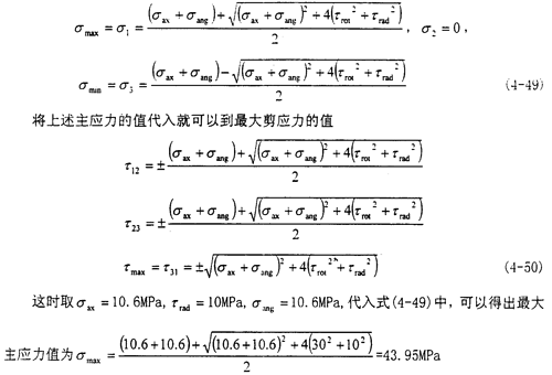 此時(shí)的應(yīng)力情況屬于三向應(yīng)力狀態(tài),所以其分析過(guò)程和徑向不對(duì)中90°以及270°以情況相似,只是這里還有了附加的軸向拉應(yīng)力和附加的角向應(yīng)力,將各個(gè)應(yīng)力值σxx=σax+σang,σyy=0,σzz=0,τxy=τrot,τyz=0,τzx=τrad分別代入式(4-29)(4-30)(4-31)中,可以得到