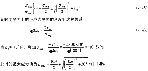 此時(shí)主平面上的正應(yīng)力平面的角度有這種關(guān)系:tg2α4=-∞,所以有α4=-45°或-135°,此時(shí)的最大應(yīng)力值為σmax=30MPa