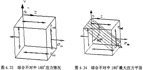 這時取σax=10.6MPa,τrad=10MPa,σang=10.6MPa,代入式(4-49)中,可以得出最大主應(yīng)力為σmax==31.6MPa