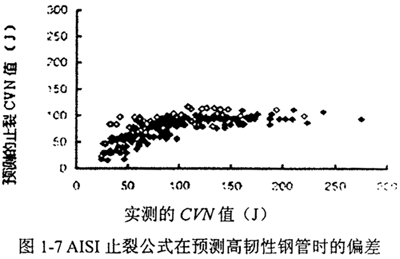 Bartell。兩步分析基于裂紋擴(kuò)展的減壓波速判據(jù),提出了行之有效的數(shù)學(xué)解法,實(shí)現(xiàn)了直接由管道工作參數(shù)推斷出止裂所需的臨界CVN沖擊韌性。后來(lái)又總結(jié)了一系列簡(jiǎn)便的經(jīng)驗(yàn)公式。在當(dāng)時(shí)的條件下,全尺寸爆破實(shí)驗(yàn)中所用的管線鋼CVN沖擊韌性一般不超過(guò)100J,CVN沖擊韌性足以描述不同鋼種的抗斷裂性能,雙曲線模型和經(jīng)驗(yàn)?zāi)J蕉寂c全尺寸爆破實(shí)驗(yàn)的結(jié)果吻合得很好。