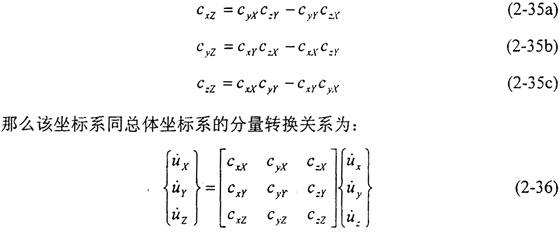 將上面的轉(zhuǎn)換矩陣定義為[c],則邊界條件中的平動(dòng)速度可按(2-36)式轉(zhuǎn)化為局部坐標(biāo)中的分量,轉(zhuǎn)動(dòng)角速度按下式定義: