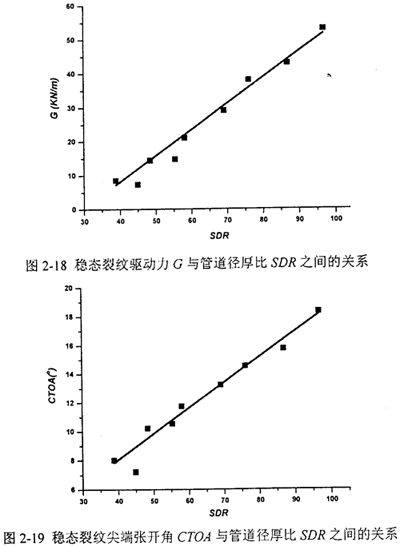 在裂紋穩(wěn)態(tài)擴展的條件下,動態(tài)能量釋放率G或裂紋尖端張開角CTOA同管道內壓p0或徑厚比SDR之間均呈線性關系。由此關系可便捷地推算任意設計參數(shù)下的裂紋驅動力。通過和第四章介紹的小試件實驗的動態(tài)斷裂韌性結果相對照,可以得到裂紋止裂或擴展的結論。