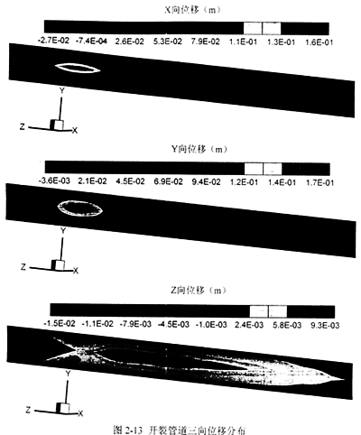 圖2-13分別按照三個方向上的位移分布在開裂前管道表面畫出云紋圖。從圖中可以看到,此種設計參數(shù)下的位移量主要發(fā)生在裂尖附近5m左右的區(qū)域,對遠端的影響較小。