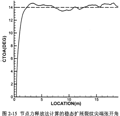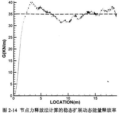 圖2-14反映了節(jié)點力釋放法計算的動態(tài)能量釋放率與裂尖位置的關系,其結果因前面提到過的有限元算法的原因而略有抖動,G的穩(wěn)態(tài)值約35KN/m,遠高于X70鋼材的斷裂韌性Gd<10KN/m。