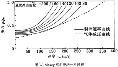雙曲線法的具體分析過程如圖3-3所示,坐標橫軸表示速度,縱軸表示氣體壓力或環(huán)向應(yīng)力。上方的一組曲線表征不同韌性水平下的斷裂速度,是內(nèi)壓或環(huán)向應(yīng)力的函數(shù)。隨著內(nèi)壓或環(huán)向應(yīng)力在斷裂過程中的減小,斷裂速度不斷降低。如果壓力或應(yīng)力足夠低,斷裂速度即減小到零而發(fā)生止裂。