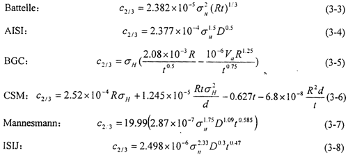 在雙曲線法的基礎(chǔ)上,結(jié)合大量的實驗結(jié)果對止裂韌性進行標定,世界各大研究機構(gòu)分別給出了簡便易算的經(jīng)驗公式用以估算臨界止裂韌性,列舉如下:
