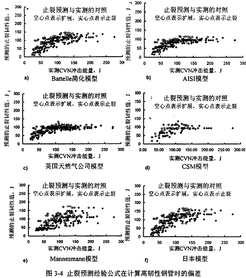 圖3-4表示了Battelle應(yīng)用Maxey雙曲線法對全尺寸實驗數(shù)據(jù)庫所做的DDF止裂韌性預測,圖3-4a至圖3-4f分別對應(yīng)于式(3-3)至式(3-8)。圖中顯示的實驗用管的鋼級包括X52到Xl00,管徑范圍從4O6mm到1422mm,實驗最高壓力超過16MPa?梢姡A測模型在管材韌性低于某一水平時預測結(jié)果與實物實驗結(jié)果基本吻合,但當管材韌性較高時出現(xiàn)明顯偏差,預測應(yīng)該止裂的管線沒有止裂。經(jīng)典的止裂預測模型在預測夏比能量值高于94J的管材時,已經(jīng)偏于危險,即過高估計了管材的止裂性能。