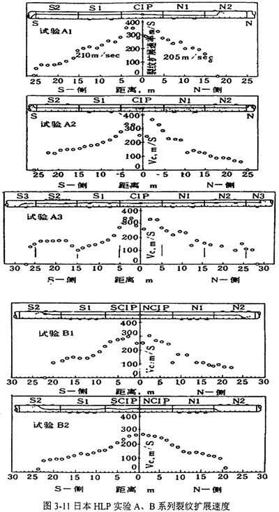 速度曲線表明,在A類實(shí)驗(yàn)中,裂紋起裂后,在韌性較低的CIP擴(kuò)展速度達(dá)以300m/s以上。裂紋進(jìn)入實(shí)驗(yàn)管后,裂紋擴(kuò)展速度隨著裂紋的擴(kuò)展而下降,實(shí)驗(yàn)A3的南側(cè)有例外,裂紋從S1到S2管裂紋擴(kuò)展速度增大,這是由于韌性排列時(shí)S2管的韌性例外地比S1低。在B類實(shí)驗(yàn)中,CIP管的最大裂紋擴(kuò)展速度率為300m/s(B1)和270m/s(B2),這與其韌性較高有關(guān)。