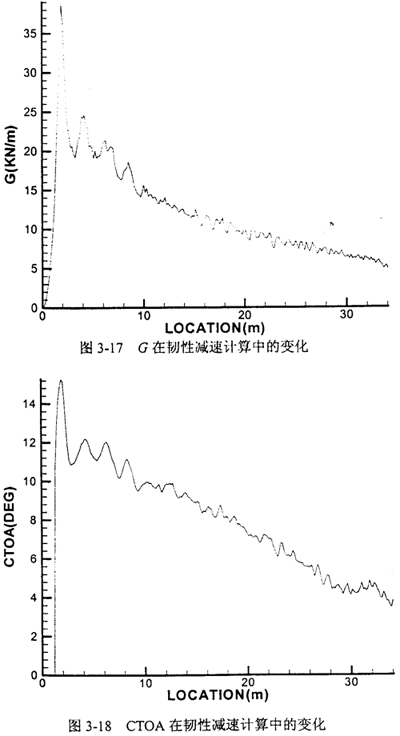 圖3-17和圖3-18是針對西氣東輸某特定設(shè)計參數(shù)的管線,應(yīng)用韌性減速機理計算時能量釋放率G和裂紋尖端張開角CTOA的變化。
