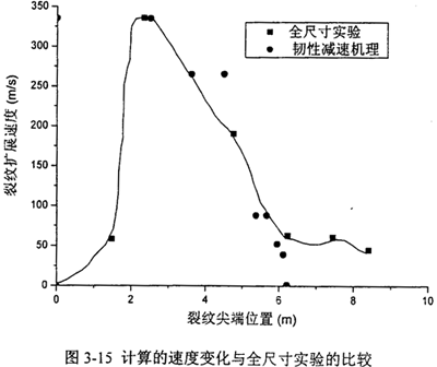本文通過上述方法,對圖3-9至圖3-12中的全尺寸實測斷裂速度曲線結(jié)果進行了校核,得到了比較吻合的結(jié)果,F(xiàn)以聯(lián)盟管道第一次實驗IE段為例,設(shè)定擴展的初速度為330m/s,速度變化的計算值同實驗對比如圖3-15所示: