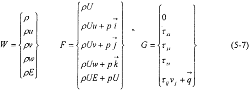 式中P為密度,U=u+v+w表示速度,E為總能,,分別為沿x,y,z方向的單位矢量。為粘性應(yīng)力項,是熱通量。
