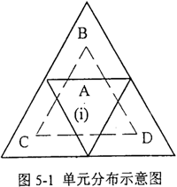 以二維情況為例,計(jì)算圖5-1中A點(diǎn)梯度可選C→B→D→C作為積分路徑,但為了保證積分的精度,最好使積分路徑構(gòu)成的封閉體形心與計(jì)算點(diǎn)重合,或至少比較接近。