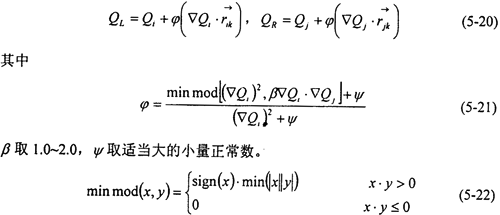 但是,由(5-18)直接得到的格式在激波附近是不穩(wěn)定的,將會(huì)出現(xiàn)非物理振蕩。迎風(fēng)格式通過限制物理量的梯度值,來保證物理量在單元內(nèi)的分布具有單調(diào)性,從而達(dá)到抑制間斷附近非物理振蕩的目的。這時(shí),(5-18)式變?yōu)?/p>