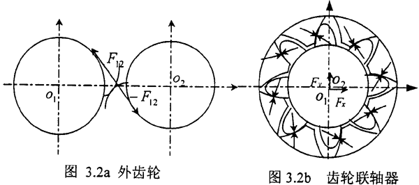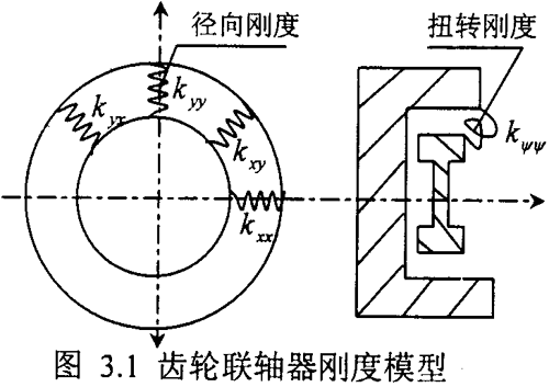上面的定義方法類似于軸承動剛度的定義,即在某一個平衡位置(x0,y0,000)處定義齒輪聯(lián)軸器剛度,從面齒輪聯(lián)軸器剛度可簡化成如圖3.1所示的模型。從上面的分析可以看出,要求得齒輪聯(lián)軸器的剛度,首先必須對內(nèi)外齒輪進行受力分析,列出靜平衡方程FH(x,y,, ψ, θ)。