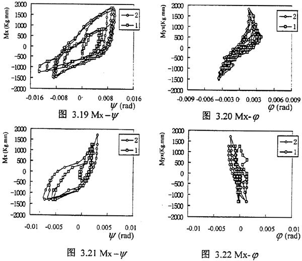 得到比較一致的結(jié)果,在齒輪聯(lián)軸器內(nèi)外齒面潤滑條件不充分時,齒面間磨擦可以看作是干磨擦;同時傳遞扭矩的增加,曲線的斜率、(即剛度有所增加)這各和理論計算結(jié)果想似(如圖3.11與3.19、3.21);并且隨著T的增加,遲滯曲線所圍的面積也隨之增大,磨擦力的影響也越顯著,這與圖3.11相同;從3.20、3.22圖中可以看出Mx方向的力矩,使內(nèi)外齒輪在ψ方向產(chǎn)生位移,這說明ψ-