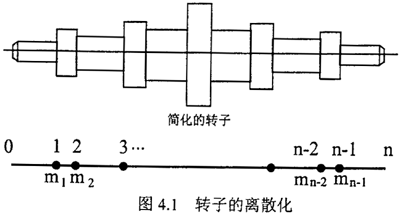 一個(gè)實(shí)際轉(zhuǎn)子,可以看作由一根變截面的軸和分布其上的若干圓盤所組成。用集總質(zhì)量法,可將其離散成n段無質(zhì)量的彈性軸和n-1個(gè)集總質(zhì)量。如圖4.1所示。具體過程見文獻(xiàn)。