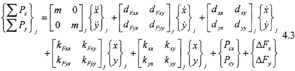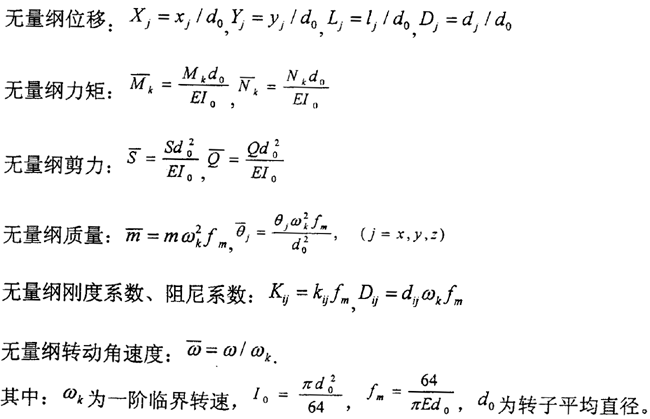 式4.3中右端第一項(xiàng)為慣性力:三、五兩項(xiàng)為滑動(dòng)軸承的油膜力;二、四兩項(xiàng)為外加阻尼力及剛度力……,Pcx,Pcy則代表與系統(tǒng)本征值無關(guān)的外加激勵(lì)力、不平衡力、重力或其它控制力。ΔFx,ΔFy為齒輪動(dòng)態(tài)嚙合力在x、y方向上的分量。當(dāng)所簡化的質(zhì)點(diǎn)是各向同性時(shí),其直徑轉(zhuǎn)動(dòng)慣量θx=θy=Jd,極轉(zhuǎn)動(dòng)慣量θz=Jp。