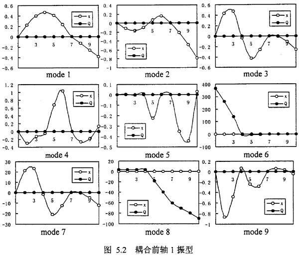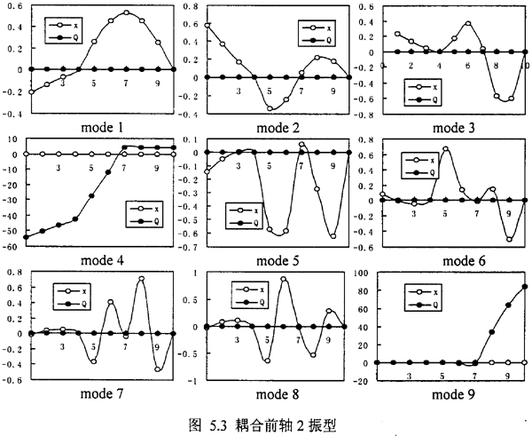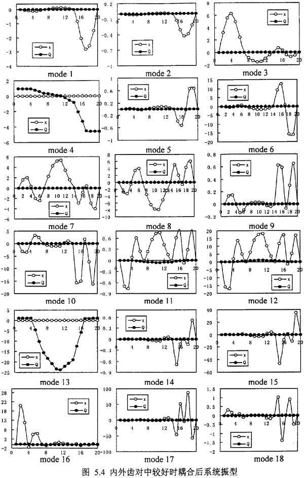 但是,另外我們可以發(fā)現(xiàn),在表5.3中出現(xiàn)了許多表5.1和表5.2中所沒(méi)有的新的固有頻率如λ4co,λ7co,λ8co,λ11co,λ12co,λ13co,觀察這些因有頻率所對(duì)應(yīng)的振型,可以發(fā)現(xiàn),它們對(duì)應(yīng)又可分為三種,1.純的彎曲耦合振型λ7co,λ8co對(duì)應(yīng)振型圖5.4中mode7、8;2.純的扭轉(zhuǎn)耦合振型λ4co,λ13co對(duì)應(yīng)振型圖5.4中mode4、13;3.彎扭振型相迭加的復(fù)振型——彎扭耦合振型λ11co,λ12co對(duì)應(yīng)振型圖5.4中mode11、12。這種彎耦合振型是由于齒輪聯(lián)軸器的耦合作用而新產(chǎn)生的,這是齒輪軸系統(tǒng)區(qū)別于一般單轉(zhuǎn)子系統(tǒng)的重要特征之一,由于彎扭耦合模態(tài)的產(chǎn)生,決定了軸系統(tǒng)的振動(dòng)是彎扭耦合振動(dòng)。