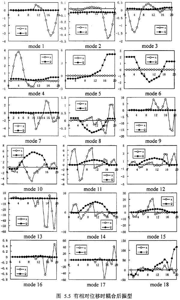 表5.3是耦合系統(tǒng)在同樣的轉(zhuǎn)速下,前18階的固有頻率,圖5.4是這些固有頻率對(duì)應(yīng)的耦合狀態(tài)下轉(zhuǎn)子的振型;橫坐標(biāo)質(zhì)點(diǎn)1~10代表軸1、11~20代表軸2;縱坐標(biāo)為振型;實(shí)點(diǎn)表示扭轉(zhuǎn)振型、空心點(diǎn)表示彎曲振型。