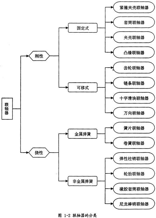 就聯(lián)軸器種類而言,若按補償兩軸相對位移能力的不同可分為:剛性聯(lián)軸器和撓性聯(lián)軸器;剛性聯(lián)軸器按能否允許兩軸有相對位移又可分為:固定式聯(lián)軸器和可移式聯(lián)軸器;撓性聯(lián)軸器按其彈性元件的不同可分為金屬彈簧聯(lián)軸器和非金屬彈簧聯(lián)軸器;若按結構可分為套筒聯(lián)軸器、鏈條聯(lián)軸器、輪胎聯(lián)軸器等等。其總的分類圖如圖1-2所示。