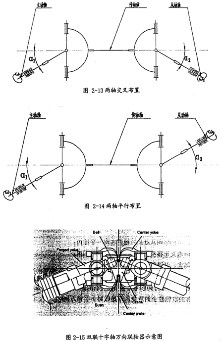 在這樣的理論指導下,人們制作了圖2-15所示的雙聯(lián)十字軸等角速萬向聯(lián)軸器。它的關鍵結構就是中間的軛機構,它保證了兩軸同軛(相當于中間軸)的夾角始終相等,從而實現(xiàn)等角速傳動。