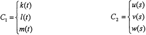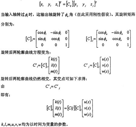 假設M點是兩軸的嚙合點(運動曲線C1和C2的交點,也就是傳力點)假設初始條件為:當時間t=0時,i(輸入軸轉(zhuǎn)角),0(輸出軸轉(zhuǎn)角)均為零,在兩坐標系OXiYiZi和OXjYjZj中,曲線Cl和C2的方程分別為: