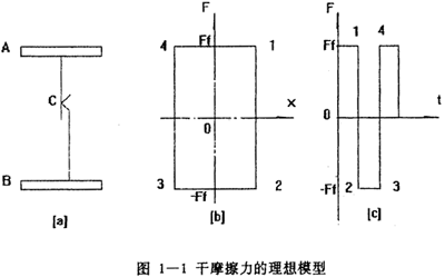 雙線性模型是非線性遲滯系統(tǒng)模型中最簡單的一種,而且也是最為久遠(yuǎn)的模型,對于它的初始機(jī)理研究最早可追溯到三十年代的Deo Hartog,他在研究干摩擦?xí)r提出了干磨擦的理想模型,他認(rèn)為在一個具有干摩擦面的單自由度系統(tǒng)中,干摩擦力隨相對滑移位移的關(guān)系可用一矩形來表示,如圖1-1所示。當(dāng)該系統(tǒng)受到外力激勵發(fā)生運動時,干摩擦力總是與運動速度反向而且阻礙運動,進(jìn)而耗損系統(tǒng)的能量,從時域的角度看,干摩擦力的波形為矩形波,Den Hartog還按能量耗散相等原理,把理想干摩擦等效成粘性阻尼。實際上干摩擦交界面,在外力小于摩擦力時,兩邊就有變形,隨著外力的增加,此變形隨之增大,這是因為交界面兩邊的物質(zhì)有一定的彈性。即使兩邊有較大的滑移時,交界面上的干摩擦力仍然不是常數(shù),而是隨振幅的增大而緩慢上升的。Earlestes等人對此作了描述,認(rèn)為一旦交界面有了滑移,干摩擦的線性力不是常數(shù)(4Ffπ),而是與相對位移X有關(guān),從Ff變到4Ff/π,表達(dá)式為= Ff+δXm,式中δ為一常數(shù),由實驗確定,在等效線性力相位上,仍認(rèn)為等效摩擦力總是與相對速度差180°。