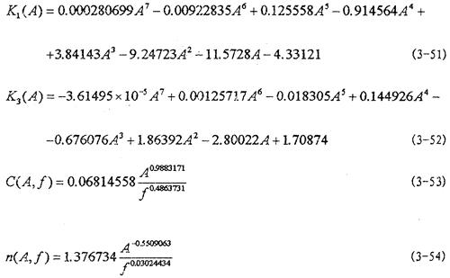 然后用線性參數(shù)辨識法和非線性參數(shù)辨識法,根據(jù)上面已經(jīng)得到的各個工況下K1(A),K3(A),K5(A),C(A,f)和n(A,f)的數(shù)值對(3-48)、(3-49)、(3-50)式中各參數(shù)進(jìn)行辨識,將辨識得到各參數(shù)代入(3-48)、(3-49)和(3-50)式得: