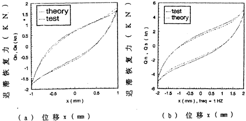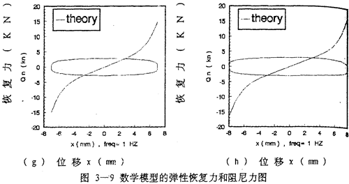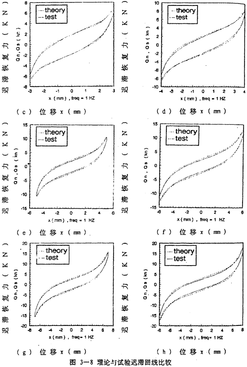 由數(shù)學(xué)模型(3-47) 計算可以得到不同激勵頻率和振幅下聯(lián)軸器恢復(fù)力遲滯回線數(shù)據(jù),為了證實(3-47)的正確性,下面畫出頻率為1赫茲、振幅為1~8毫米各工況下數(shù)學(xué)模型計算的理論數(shù)據(jù)和試驗數(shù)據(jù)表示的遲滯回線圖,如圖(3-8)(a)~(h)(見51~52頁)所示,圖中虛線為理論回線,實線為試驗遲滯回線。從圖中可知,理論遲滯回線十分接近試驗遲滯回線,由此可以說明建立的聯(lián)軸器數(shù)學(xué)模型(3-47)式可較好地描述恢復(fù)力隨振幅A頻率f、瞬時位移x和速度變化的規(guī)律,較圓滿地解決了聯(lián)軸器恢復(fù)力建模與參數(shù)函數(shù)辨識的難題。