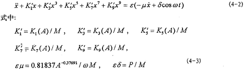 目前文獻上的一些方法對于弱非線性系統(tǒng)是有效的,而對于(4-2)式的強非線性系統(tǒng)則遇到了麻煩。由于描述非線性振動系統(tǒng)的微分方程種類繁多,沒有普遍的解法,因此,仍然只有極少非線性振動方程可求得精確解?尚械霓k法是針對不同非線性振動方程的特點尋求一些近似數(shù)值解法。為研究方便,將(4-2)式進一步寫成以下形式: