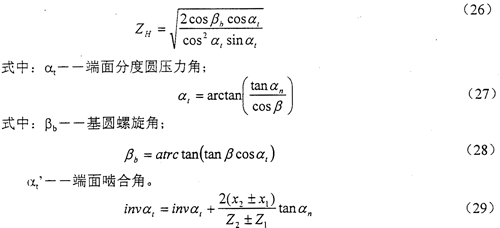 節(jié)點區(qū)域系數(shù)ZH是考慮節(jié)點處齒廓曲率對接觸應力的影響,并將分度圓上切向力折算為節(jié)圓上法向力的系數(shù)。ZH數(shù)值可由式(26)計算得出。