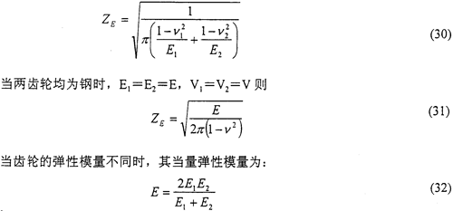 彈性系數(shù)ZE是用以考慮霉爛彈性模量E和泊桑比v對赫茲應力的影響。其數(shù)值可按實際材料彈性模量E和泊桑比v由式(30)計算得出。