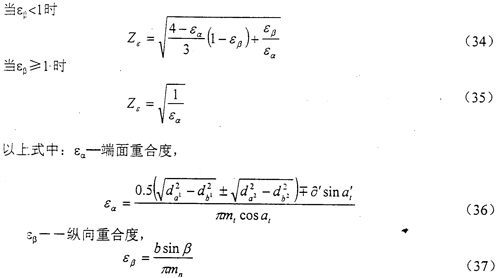 重合度系數(shù)Zε是用以考慮重合度對單位齒寬載荷的影響。Zε可由式(33)、(34)、(35)計算得出。