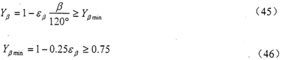 螺旋角系數(shù)Yβ是考慮螺旋角造成的接觸線傾斜對齒根應力產(chǎn)生影響的系數(shù)。其數(shù)值可以通過式(45)和(46)計算。