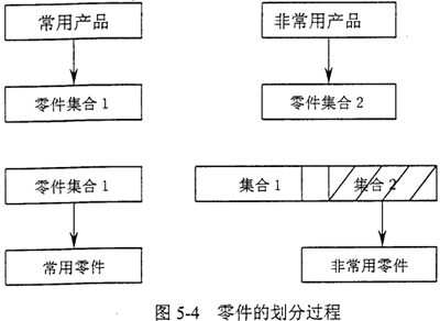 劃分常用零件與非常用零件的依據(jù)是:詳細(xì)劃分各種系列產(chǎn)品中對(duì)應(yīng)的零件,分為常用要求和非常用要求二種狀態(tài),常用要求下對(duì)應(yīng)下的零件集合為常用零件:非常用要求下對(duì)應(yīng)下的零件集合,減去常用零件集合為非常用零件,即扣除常用零件便得非常用零件。具體過(guò)程見圖5-4。