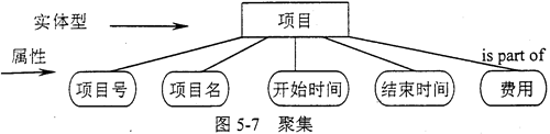 2、聚集(Aggregation):定義某一類型的組成部分。她抽象了對(duì)象內(nèi)部類型和成分之間“is part of”的語(yǔ)義。在E-R模型中若干屬性的聚集組成了實(shí)體型,就這種抽象。如圖5-7。