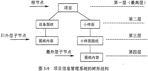 對(duì)于項(xiàng)目信息管理系統(tǒng),有自己的特殊性,從邏輯結(jié)構(gòu)上說(shuō),他是一個(gè)典型的樹型結(jié)構(gòu),每個(gè)節(jié)點(diǎn)除根節(jié)點(diǎn)外,有自己的子節(jié)點(diǎn);每個(gè)節(jié)點(diǎn)除最外層子節(jié)點(diǎn)外,有自己的父節(jié)點(diǎn)。在本系統(tǒng)中,項(xiàng)目是整個(gè)樹結(jié)構(gòu)的根節(jié)點(diǎn),而個(gè)圖紙內(nèi)容是最外層子節(jié)點(diǎn),項(xiàng)目是設(shè)備圖紙和小樣圖的父節(jié)點(diǎn),圖紙、小樣圖又是圖紙內(nèi)容的父節(jié)點(diǎn),見圖5-9。