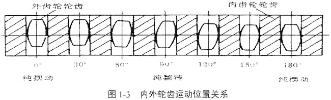 鼓形齒聯(lián)軸器的運(yùn)動(dòng)是復(fù)雜的空間運(yùn)動(dòng),現(xiàn)有資料均把它簡(jiǎn)化為展開(kāi)的平面運(yùn)動(dòng)來(lái)進(jìn)行分析,在有軸間傾角的狀態(tài)下,將運(yùn)動(dòng)分為齒的擺動(dòng)運(yùn)動(dòng)和翻轉(zhuǎn)運(yùn)動(dòng)。這兩種運(yùn)動(dòng)在嚙合過(guò)程的半周中經(jīng)歷純擺動(dòng)—復(fù)合運(yùn)動(dòng)—純翻轉(zhuǎn)—復(fù)合運(yùn)動(dòng)—純擺動(dòng)的循環(huán)運(yùn)動(dòng)過(guò)程,如圖1-3所示。純擺—純翻轉(zhuǎn)的相位差為90°。在非純擺動(dòng)和純翻轉(zhuǎn)運(yùn)動(dòng)過(guò)程中,內(nèi)外齒的相對(duì)運(yùn)動(dòng)是擺動(dòng)運(yùn)動(dòng)和翻轉(zhuǎn)運(yùn)動(dòng)的復(fù)合運(yùn)動(dòng)。顯然這種簡(jiǎn)化分析方法是很粗略的,無(wú)法確切地描述它們的空間嚙合狀態(tài),但是它對(duì)于分析齒向位移、棱邊卡死現(xiàn)象及說(shuō)明某一輪齒所處周向位置是有意義的。