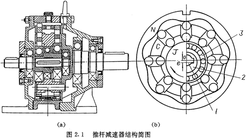 推桿減速器的結構簡圖如圖2.1所示,它由四個部分組成:1.激波器J 由輸入軸1、偏心套2、轉臂軸承3所組成。為平衡激波器所產(chǎn)生的慣性力和抵消激波器上的徑向力,一般采用雙排結構,并使它們的相位差為180°。