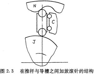 工程技術人員在實踐中圍繞著傳動圈的結構提出了不少改進方案。一種想法是在推植與導槽之間加放滾針,軌圖2.3所示,使移動副轉換成通過滾動體接觸的滾動副。但由于實際生產(chǎn)中工藝上的原因,這種方法沒有被采用。