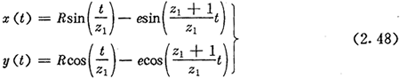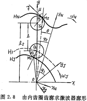 由上面可以看出,在選定激波器廓形TJ=TJ(θ)的情況下,正反兩種結(jié)構(gòu)所得到的內(nèi)齒圈齒廓方程式(2.21)與式(2.22)在形式上是不同的。對(duì)于反向結(jié)構(gòu),用-θ代換激波器方程中的θ,即令TJ=TJ(-θ),則θ增加的方向?yàn)轫槙r(shí)針方向,若激波器廓形可表示為偶函數(shù),即TJ(—θ)=TJ(θ),讓激波器按逆時(shí)針方向轉(zhuǎn)動(dòng),則所得的內(nèi)齒圈齒廓方程式完全與(2.21)式相同。因而齒廓方程式(2.22)與式(2.21)雖然形式不同,但實(shí)質(zhì)是一樣的。區(qū)別在于參數(shù)吸的取值方向,今后以式(2.21)作為內(nèi)齒圈齒廓的標(biāo)準(zhǔn)形式。