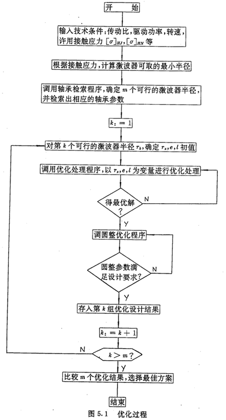 由于激波器一般使用通用軸承,所以激波器半徑Tb應結合軸承標準來選擇。在程序中,先給各傳動參數(shù)指定其取值范圍的中間數(shù)值,然后根據(jù)接觸應力計算,確定滿足強度條件的最小激波器半徑,由軸承檢索程序,確定若干個可行的激波器半徑。在確定可行的激波器半徑時,為了使減速器外徑尺寸不致過大,僅把與應力計算結果相近的軸承半徑及其相鄰型號半徑作為可行的激波器半徑。對每一個可行的激器半徑Tb,調用優(yōu)化子程序以Tz,e,l為優(yōu)化變量進行優(yōu)化處理。其算法流程如圖5.1所示。