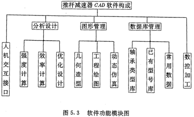 軟件主要由分析設計、圖形管理、數(shù)據(jù)庫管理及摟控加工四大部分組成,并提供了一個友好的人機交互接口界面用于實現(xiàn)漢字人機對話。本交互接口由三級推拉彈出式菜單組成。軟件模塊結構如圖5.3所示。各大模塊的主要功能及特點如下: