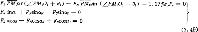 在方程組織(7.49)中,當(dāng)激波器轉(zhuǎn)角φ1確定后,除FJ、FN、FC及αC外,其它各量都相應(yīng)按前述公式有了確定的數(shù)值。其中摩擦角θ1、θ2及摩擦系數(shù)f3的取值,由選用的材料及潤滑情況決定。驅(qū)動力FJ可根據(jù)輸入功率求出,因而待求的未知數(shù)是FN、FC和αC