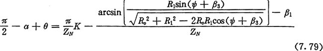 由式(7.71)及式(7.73)可得齒廓AB上與跨槽數(shù)為K的齒郭具有公法線的點的條件式為: