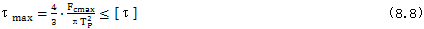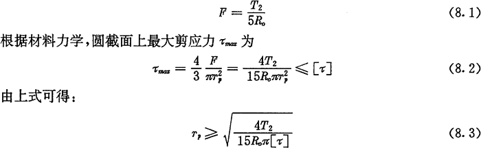將上述所得基本設(shè)計(jì)參數(shù)的值代入式(7.70)并求最大值可得Fcmax=1082.5(N),將其代入式(8.8)得τmax=28.69(N/mm2),小于所選軸銷的許用接觸應(yīng)力,故滿足設(shè)計(jì)要求。