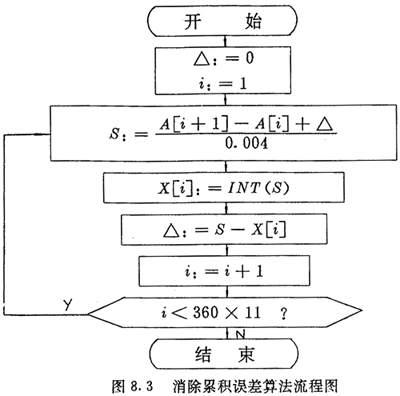 用式(4.4)及式(4.5)計(jì)算nx和nc時(shí),得到的不可能恰好是整數(shù),為了消除累積誤差,每段中應(yīng)把上一段的誤差考慮進(jìn)去。例如對(duì)nx的計(jì)算,假定表8.1中ρd的360×11個(gè)數(shù)已存在數(shù)組A中,計(jì)算后的360×11-l個(gè)脈沖數(shù)nx存在數(shù)組x中,則計(jì)算過程如圖8.3所示。