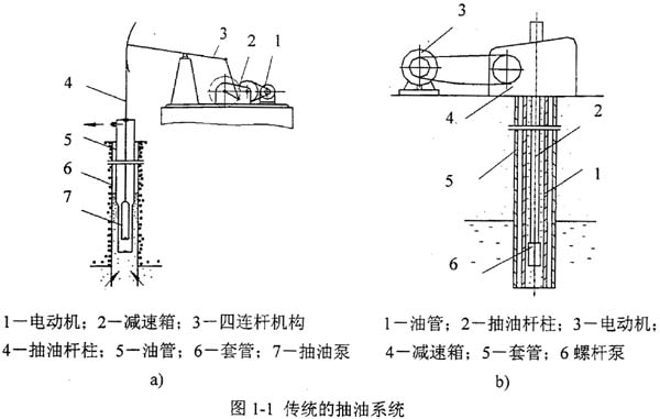 傳統(tǒng)的采油設(shè)備主要以游梁式抽油機(jī)(圖1-la)為主,其由三部分組成:一是地面部分-游梁式抽油機(jī),包括電動機(jī)、減速箱和四連桿機(jī)構(gòu);二是井下部分-抽油泵,它懸掛在套管中油管的下端;三是聯(lián)系地面和井下的中間部分-抽油桿柱,它由一種或幾種直徑的抽油桿和接箍組成。游梁式抽油機(jī)的優(yōu)點(diǎn)是結(jié)構(gòu)簡單、制造容易、維護(hù)方便,缺點(diǎn)是抽油泵排量太小,一般為50~100米3/天。而且該系統(tǒng)含砂敏感,地面驅(qū)動部分體積龐大。為了減輕抽油機(jī)的重量,人們又開發(fā)了無游梁式抽油機(jī),它分為機(jī)械無游梁式抽油機(jī)和液壓無游梁式抽油機(jī)兩種。它們的共同特點(diǎn)是保留抽油桿和原來的抽油泵,維持有桿泵抽油設(shè)備的工作方式。無游梁式抽油機(jī),特別是液壓無游梁式抽油機(jī)的采用,可以降低抽油桿中的應(yīng)力和改善它的工作條件,因而擴(kuò)大了有桿泵抽油設(shè)備的使用范圍。然而,無論是游梁式抽油機(jī)還是無游梁式抽油機(jī),由于其抽油泵固有的結(jié)構(gòu)特點(diǎn),在抽取含砂、含氣、含水、含蠟、含膠質(zhì)、含石膏的原油、稠油和低滲透層原油時,均無法滿足工作要求。