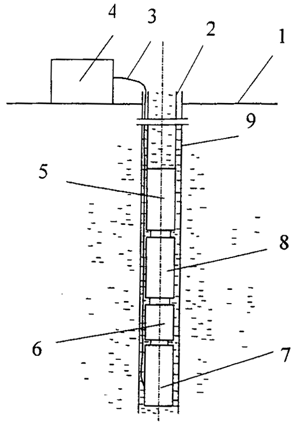 1-地面;2-油管;3-電纜;4-電源;5-螺桿泵;6-減速器;7-潛油電機(jī);8-保護(hù)器;9-套管